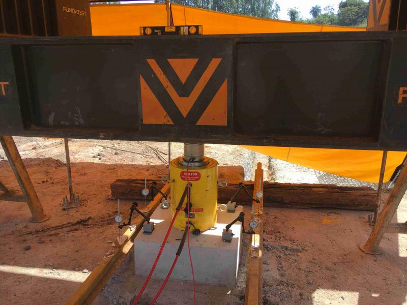 elemento de fundação é solicitado com cargas em verdadeira grandeza, aplicadas geralmente por um cilindro hidráulico que reage contra um sistema constituído de vigas metálicas e estacas e/ou tirantes de reação.