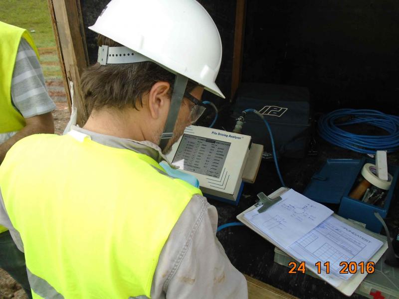 O ensaio de carregamento dinâmico em estacas é efetuado utilizando-se de um conjunto de equipamentos (sensores e computadores) para aquisição e tratamento dos sinais colhidos em campo e analisados posteriormente por engenheiro especializado, tendo como resultado final a avalição da capacidade de carga do elemento de fundação.